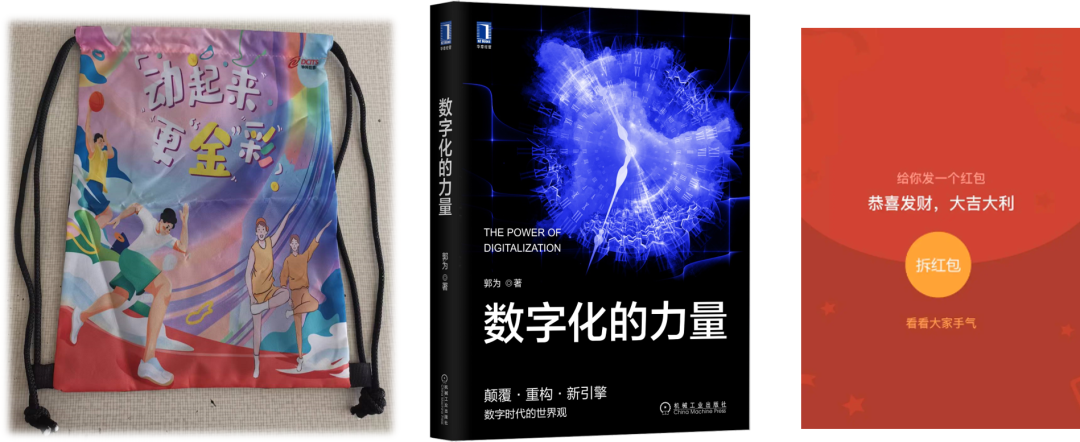 完成调研参与抽奖,即有机会获得郭总新书《数字化的力量》、微信红包、动起来活动限量款潮包等好礼,早参与、早中奖,调研截至6月30日。快来扫码参加哟!听说每天的中奖率达80%。